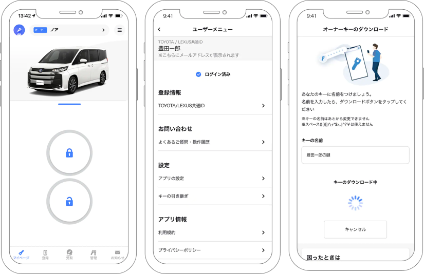 いつものスマートフォンでドライブができます。 リモート操作アプリを起動すれば簡単な操作でクルマのドアロックを解除できます。 また、リモート操作アプリでエンジンをかけ、ドライブに出かけられます。 スマートフォンがあれば困ることはありません。デジタルキーを用いると物理的な鍵が不要になり、スマートフォンで施錠や解錠ができます。 クラウド上で鍵を管理することで他者によるアクセスを拒否でき、オーナーを識別することができるため、防犯性能も優れています。 また、一時的利用できる鍵のため、設定時間が過ぎると鍵の機能を消失させることも可能です。