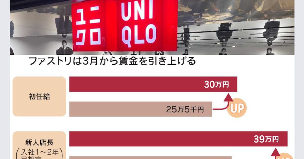衣料品店「ユニクロ」を展開するファーストリテイリングは1日、東京都内で入社式を開いた。 国内の正社員の賃金を今月から最大4割上げると発表している。 初任給も月25万5千円から30万円に上がり、新入社員からは「驚いた」という声もあがった。