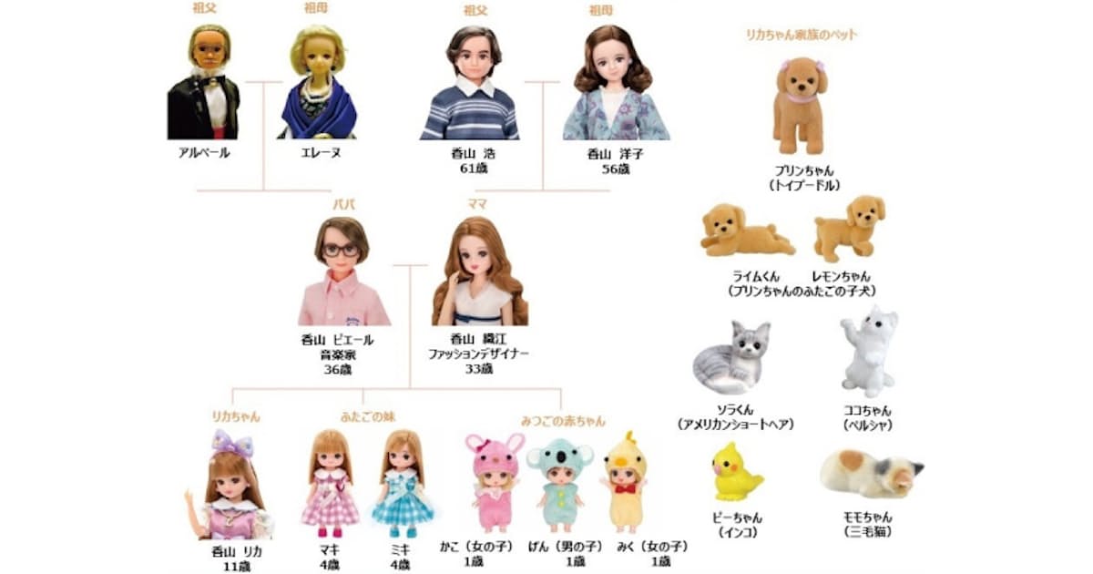名前は香山洋子さん。 母方のおばあちゃんで年齢は56歳。 おばあちゃんの住む家に隣接する花屋兼カフェのオーナーという設定だ。リカちゃんは8人家族の大所帯!