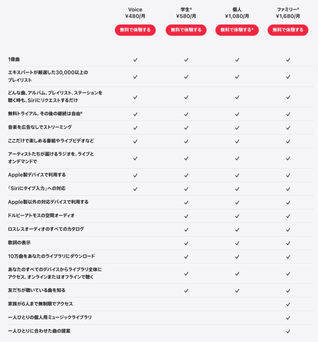 Apple Musicの料金プランは3つ用意されています。 個人向けプランは月額1080円(税込・以下すべて)。 家族で利用できるファミリープランは月額1680円です。 ファミリープランはiCloudのファミリー共有を介して、最大6人で利用できます。「Apple Music」の料金プラン一覧