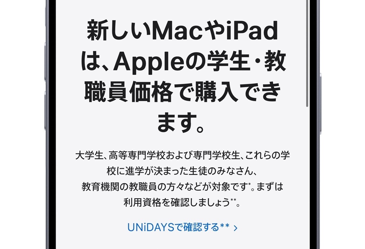 *大学、高等専門学校、専門学校の学生、それらの学校に進学が決まった生徒、大学受験予備校生は父母による代理購入もできます。 対象の詳細はAppleの学生・教職員向けストア対象教育機関にてご確認下さい。